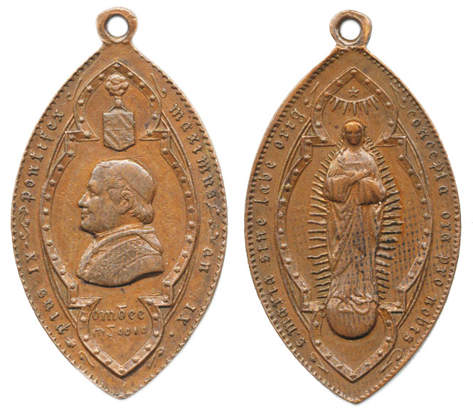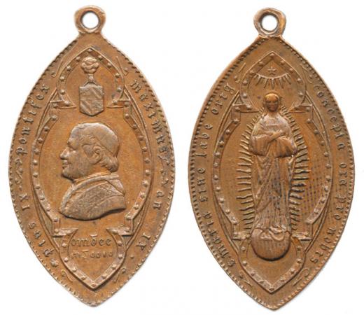 Nesign. - medaile na vyhlášení dogmatu o Neposkvrněném početí Panny Marie z 9.roku pontifikátu 1854, poprsí papeže Pia IX., opis / Panna Marie zářící plamínkovými paprsky, opis, Cu ve tvaru mandorly 26x43 mm_orig.raž.ouško