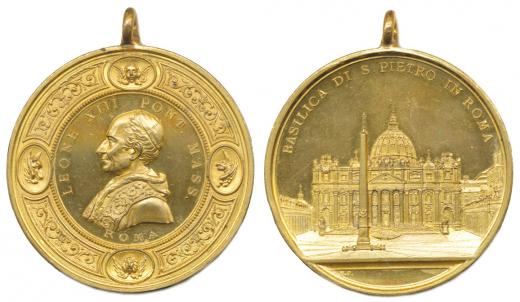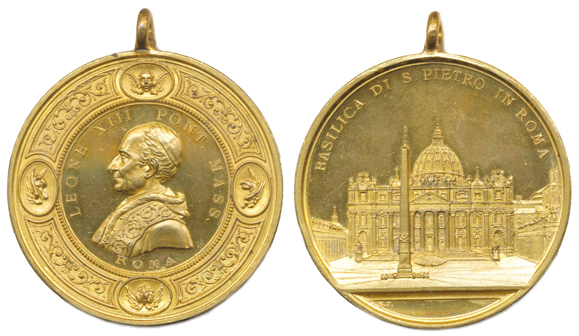 Medaile pontifikační b.l. (1878) Poprsí papeže zleva, opis, v ozdobném okraji čtyři medailonky se symboly evangelistů / basilika Sv.Petra v Římě, opis Sign.S.J., Pozlac.bronz 47 mm