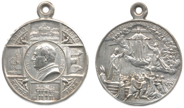 Kissing - medaile na Svatý rok 1925 Zářící široký kříž, na němž jsou čeyři římské basiliky, uprostřed poprsí papeže zleva, vročení / Kristus na oblaku s rozpjatáma rukama před křížem, papež před Svatou bránou, Alpaka 26 mm, 8,05 g _orig.raž.ouško