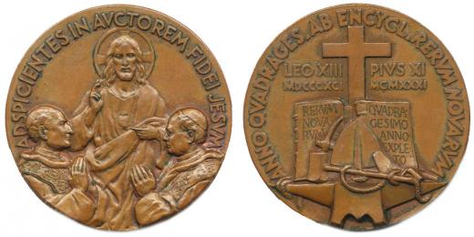 Mezzana - 40 let od vydání encykliky RERUM NOVARUM 1891-1931 Kristus žehná klečícím, opis / pracovní nástroje před otevřenou biblí Sign., Bronz 37 mm