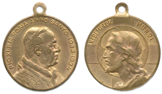 Nesign. - medaile na Svatý rok 1933 - 1934 Poprsí papeže zprava, opis / zářící hlava Krista Vykupitele zleva, opis, Nesign., Bronz 21 mm_orig.raž.ouško tém.