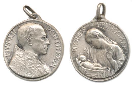 Mistrvzzi - pontifikační medaile b.l. (1939) Poprsí papeže zprava, opis / Panna Marie nad košíkem s Ježíškem, opis, Sign., Punc., Ag 25,5 mm, 7,65 g_orig.raž.ouško se závěsem