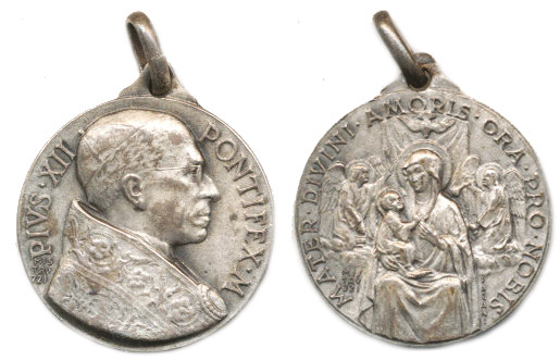 Mistrvzzi, Pagani - medaile na paměť slibu papeže 4.6.1944 Poprsí papeže zprava, opis / obraz z chrámu Santa Maria, opis Alpaka 20 mm, 4,08 g_orig.raž.ouško se závěsem