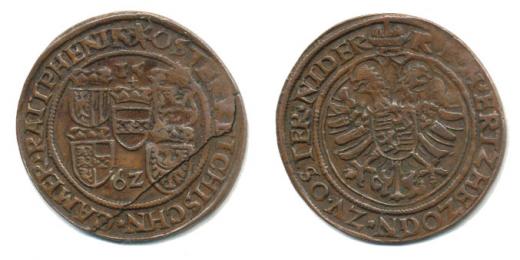 Početní fenik 1562 pro Dolní Rakousko, imincm.A.Hartmann pětidílný znak, opis / dvouhlavý orel, opis, Cu 25 mm, Prokisch.A.3/1/35 (samostatný typ)_dr.naprasklý raž. R!