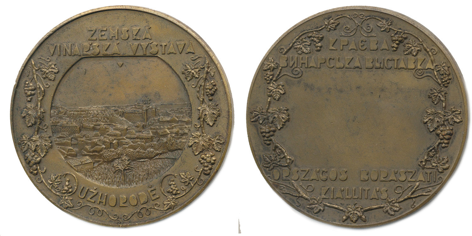 Zemská vinařská výstava, b.l. (cca 1930), pohled na město, po obvodu hrozny vína, 2řádk.český nápis, opis / po obvodu hrozny vína, 2řřádk.rusínský nápis a 2řádk.maďarský nápis, uprostřed volná plocha k udílění, Sign.FN, Bronz 60 mm, 76,07 g_R!