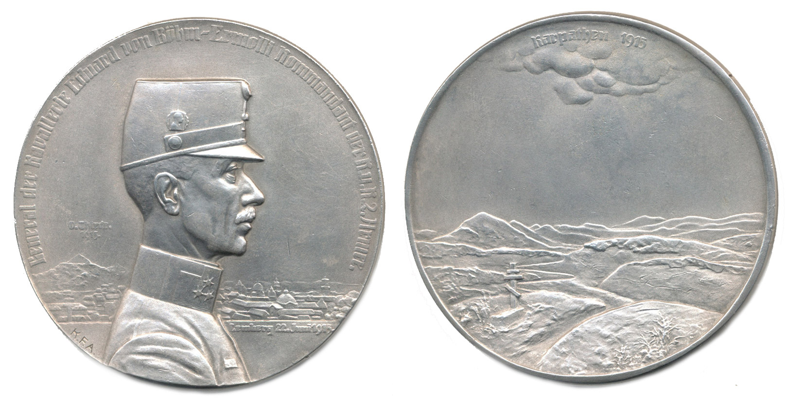 O.Thiede K.F.A. - Eduard von Böhm - Ermolli - velitel 2.rakouské armády, poprsí zprava, opis / pohled na Karpaty - Lemberg (Lvov) 22.6.1915, Postř.med.64 mm, 110,18 g_orig.etue se zlac.erbem a písmem