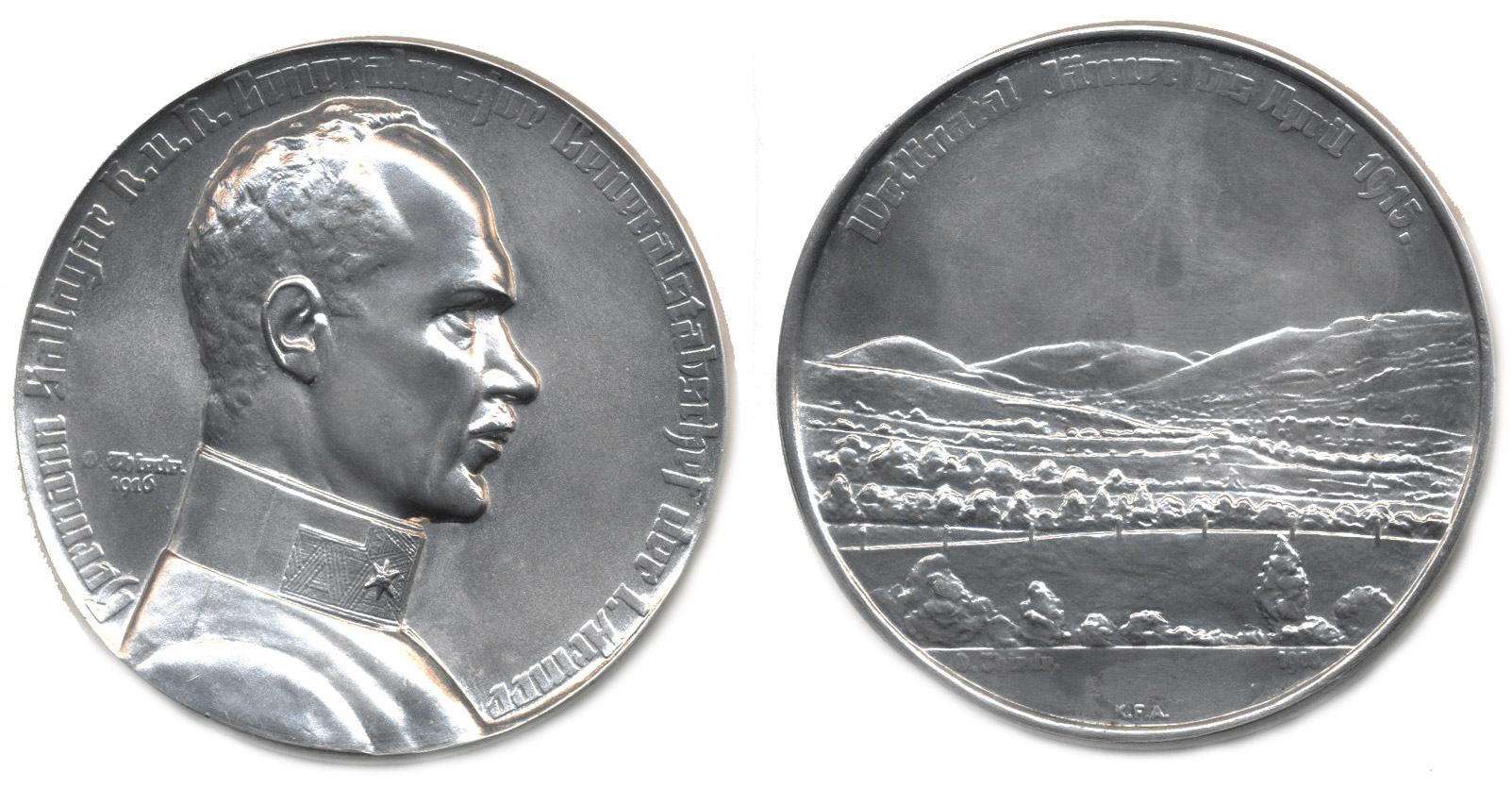 O.Thiede K.F.A. - Hermann Sallagar - generálmajor generálního štábu, velitel 1 armády, 1916, poprsí zprava, opis / pohled na Wetlinatal - leden - duben 1915 , Sign., Postř.med.65 mm, 100,89 g