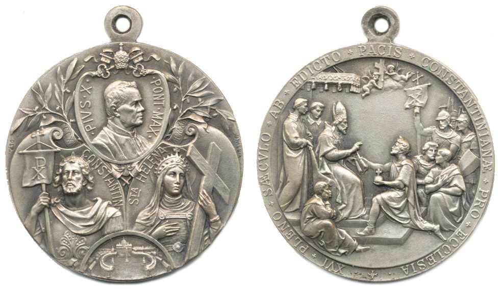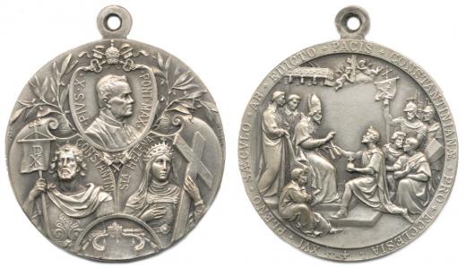 Kissing - medaile k 1600.výročí Konstantinova ediktu 1913 tři kartuše s papežem Piem X., císařem Konstantinem a císařovnou Helenou / klečící císař s korunovačním jablkem předává listinu žehnajícímu papeži, opis, Alpaka 40 mm, 26,94 g_orig.raž.ouško