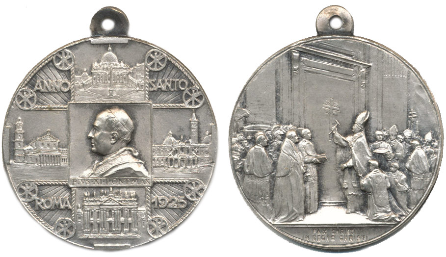 E.Boninsegna - medaile na Svatý rok 1925 Zářící široký kříž, na němž jsou čeyři římské basiliky, uprostřed poprsí papeže zleva, vročení / výjev otevírání zazděné Svaté brány, 2řádk.nápis v úseči, Sign., Alpaka 37 mm, 20,06 g_orig.raž.ouško
