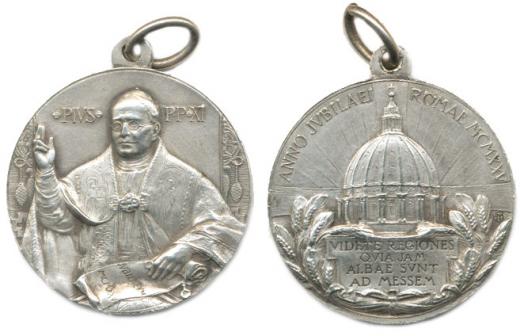 E.Boninsegna - medaile na Svatý rok 1925 Žehnající papež v pluviálu pokládá na zeměkouli listinu / tabulka položená na svazcích obilí, za ní zářící kopule basiliky sv.Petra v Římě, opis, Sign.monogram, Alpaka 26,5 mm, 7,22 g_orig.raž.ouško