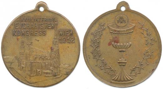 Nesign. - XXIII. mezinárodní eucharistický kongres, 1912 Chrám sv.Štěpána, 4řádk.nápis / kalich ve věnci Mosaz 33 mm_orig.raž.ouško