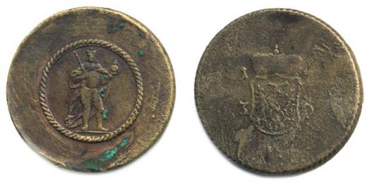 2 Dukátové závaží 1739, Mosaz 22 mm, 6,49 g, ČS.tab.Cr.926 Fs.926, starý podložní lístek_dr.st.kor. v rev. RR!