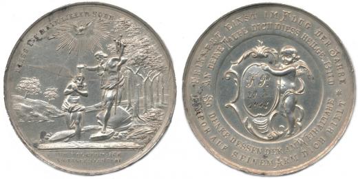 L.Zimpel - Sv.Jan křtí Krista, nad nimi Duch svatý v podobě holubice, krajina se stromy, písmo / Putti drží kartuš s rytým věnováním F.P. / 29.X. / 1918, dvojitý něm.opis, Sign., Ag 39 mm, 25,22 g, Gr.1424_tém.