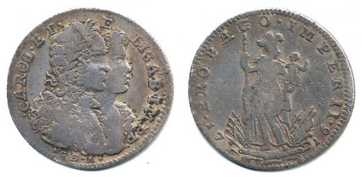Tari (2 Carlini) 1716 - na narození arc.Leopolda Dvojportrét císařského páru, opis / alegorická postava ženy s dítětem opis PROPAGO.IMPERII, Ag 24 mm, 4.21 g, Sch.10, Mo.1461, LG.II/919_RR!