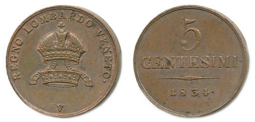 Cu 5 Centesimi 1834 V, P.52