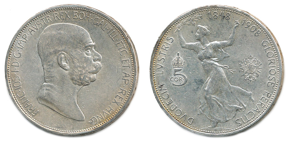 5 Koruna 1908 b.zn. - jubilejní_tém.