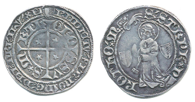 Groš b.l., klečící sv.Štěpán se znaky, opis / kříž, dvojitý opis (14.stol.), Wend.II.F-h-3, Sa.1890/922_č.ned. R!