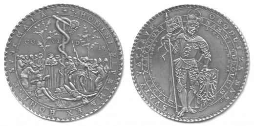 P.Soušek - morový medaile Covid 19, 2020 Stojící sv.Václav s praporcem a se štítem, dvojitý opis / had na kříži skupina mužů, opis, Sign.Sou, Ag 999/1000, 44 mm, 28,95 g