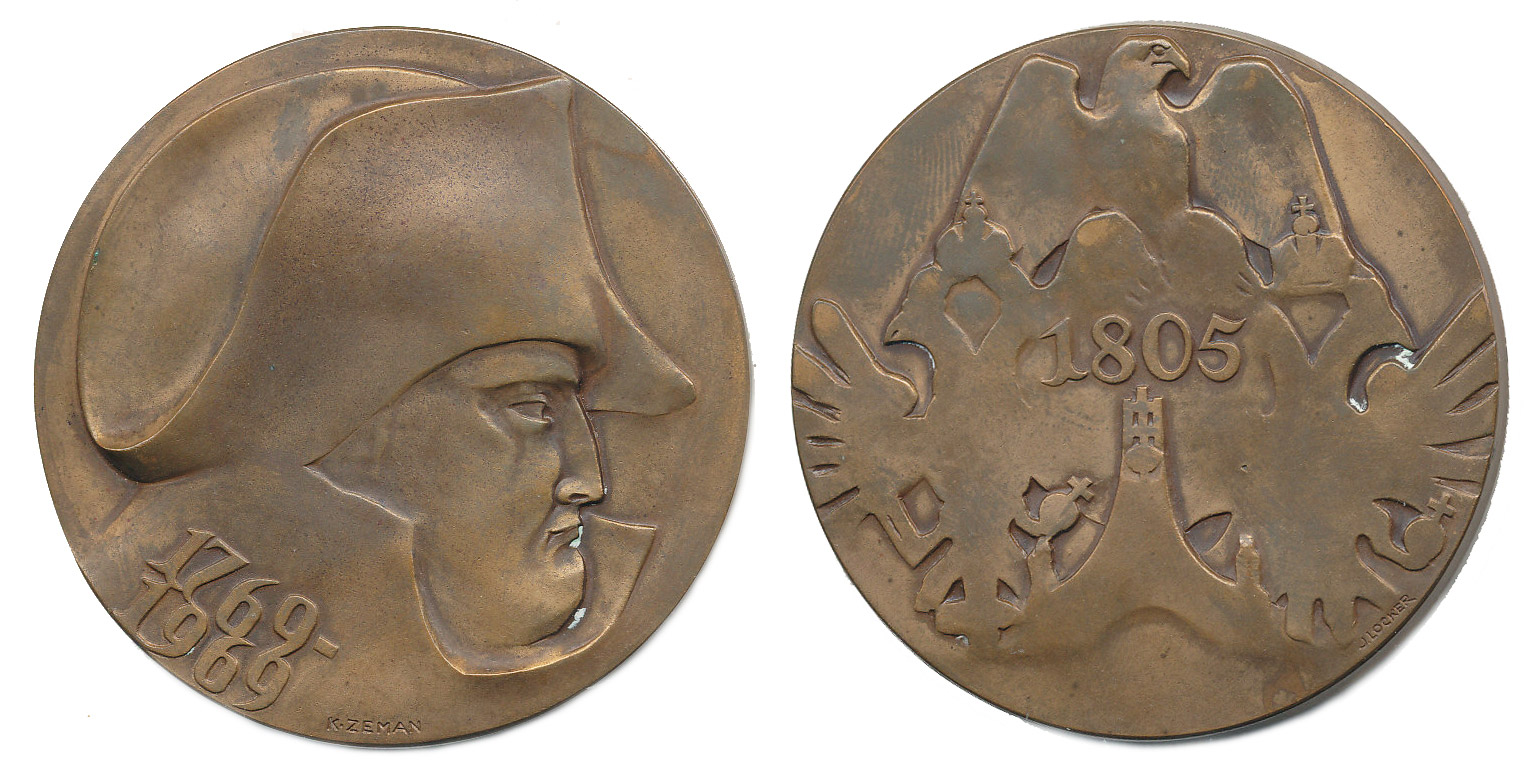 Napoleon Bonaparte, 200.výročí narození, 1769 - 1969 Hlava v klobouku zprava, vročení / pomník u Slavkova, letopočet 1805, tři styliz. orli, Sign., Bronz 60 mm
