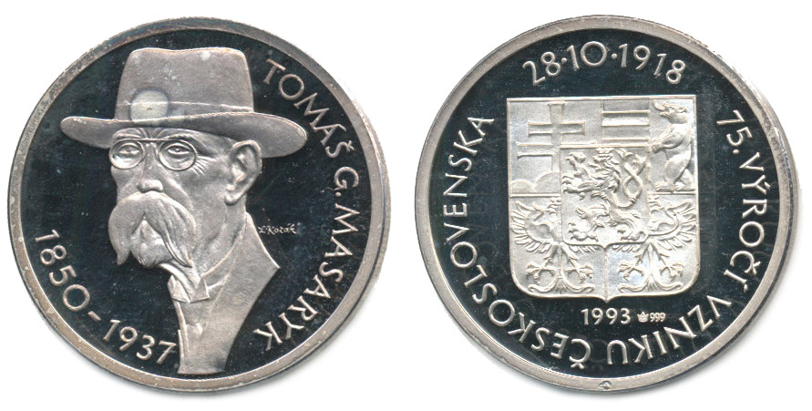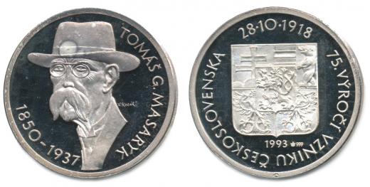 L.Kozák - T.G.Masaryk - k 75.výročí vzniku ČSR 1993 Poprsí čelně, opis / státní znak, opis, Punc.999, Ag 35 mm, 14.9 g Nov.01.226a