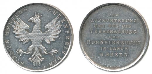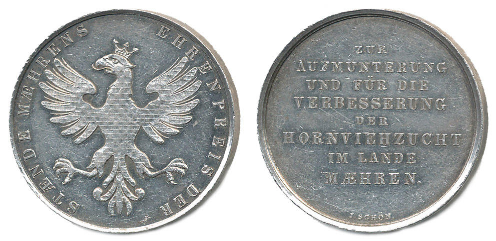 J.Schön - čestná odměna stavů moravských , b.l. (cca 1840) Moravská orlice, opis / 8řádk.nápis (pro zlepšení chovu dobytka) Sign., Ag 39 mm, 26,22 g, MKČ.139/1_R! tém.