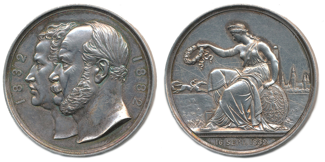 Vratislav (Breslau) - k 50.výročí Slezského závodního klubu 16.9.1832 - 1882, dvojportrét Fr.Wilhelma III. a Wilhelma I. zleva, vročení / sedící Silesia zleva, v pozadí věže města a kůň s jezdcem,vročení v úseči, Sign.W.Kullrich, F.Weigand, Ag 50,5 mm, 58,56 g_tém.