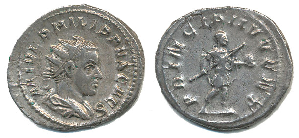 AR Antoninianus, Rv:"PRINCIPI IVVENT.", stojící císař zleva S.2552, C.48, RIC.218d - ražba z let 244 - 46