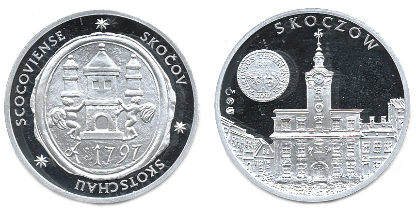 Skočov 1797 - 2017, znak města, opis / pohled na radnici, opis Ag 999, 35 mm, 15,99 g