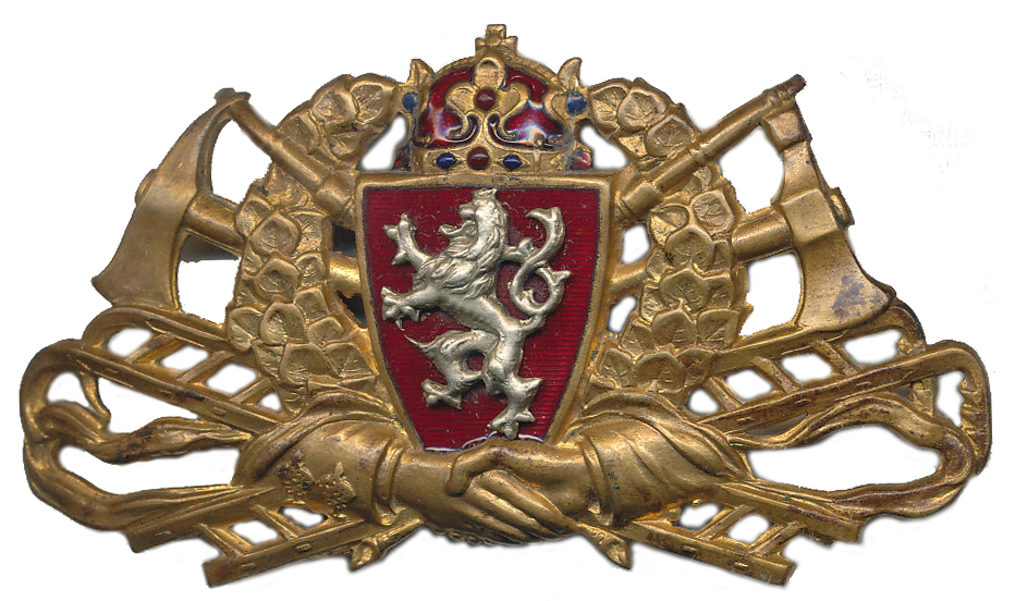 Čechy - hasičský zlatistý červeně smaltovaný se stříbřitým lvem ve znaku 40x78 mm - hasičský odznak s atributy na hasičskou přilbu
