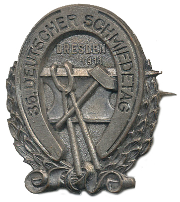 Dresden (Drážďany) - 36.německé kovářské dny 1911 Kovářské atributy v podkově, po obvodu opis v ozdobné kartuši z dubových listů, Dutý bronz.plech 27,5x32,5 mm_připínací