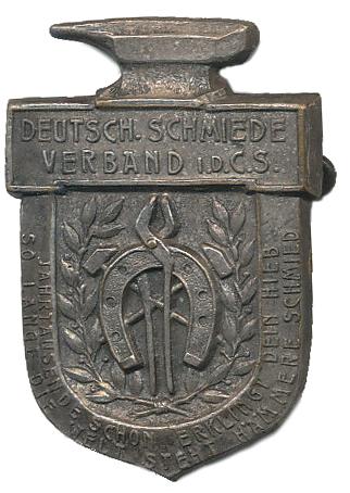 Německé sdružení kovářů v C.S., b.l. Kovářské atributy v podkově, po obvodu 2řádk.něm.nápis a dvojitý opis, Bronz.plech.odznak převýšený kovadlinou 25x34,5 mmV rev.seign. L.CH.R.Lauer Nürnberg, Berlin_připínací