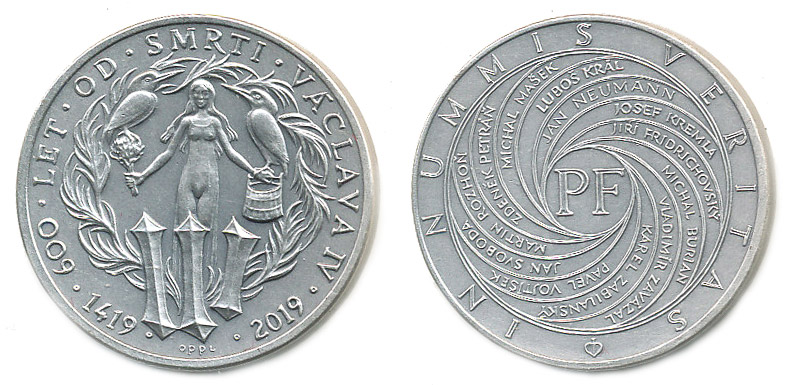 Praha - PF 2019, 600 let od smrti krále Václava IV. Stojící ženská postava, opis / ve spirále jména 12 členů výboru Sign.Oppl, Ag patinov. 30 mm, 14,9 g, nákl. 47 ks, MF.C13/17a
