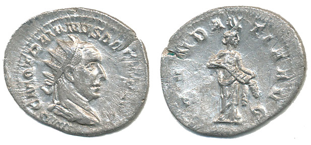 AR Antoninianus, Rv: "ABVNDANTIA.AVG", stojící Abundatia zprava, S.2590, C.2, RIC.10b_dr.ned. při okr. oválný stříž.