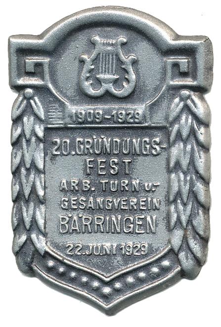 Perning u Ostrova (Bärringen) - slavnost k 20.výr.založení prac. tělocvičného a pěveckého spolku 22.6.1929, Bílý plech 35x56 mm _s jehlou