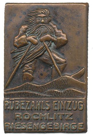 Rokytnice n.J. (Rochlitz) - příchod Rübezahla do Rokytnice v Krkonoších b.l., Cu plech 25x39 mm_připínací