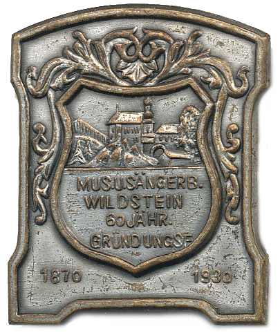 Skalná u Chebu (Wildstein) - slavnost k 60.výr. založení hudebního a pěveckého spolku 1870 - 1930, Bílý plech 32x39,5 mm_připínací