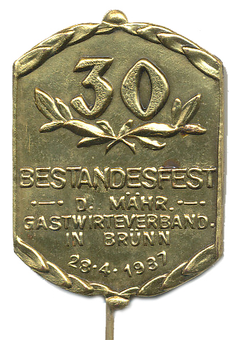 Brno (Brünn) - k 30.výročí moravského spolku hostinských 1937 Žlutý plech 25,5x36,5 mm_s jehlou