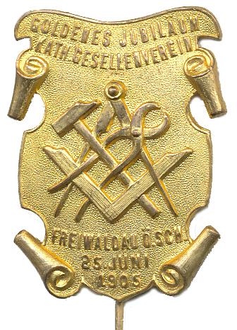 Jeseník (Freiewaldau) - zlaté jubileum Katolického společného spolku 25.6.1905, Žlutý plech 26x35,5 mm_s jehlou