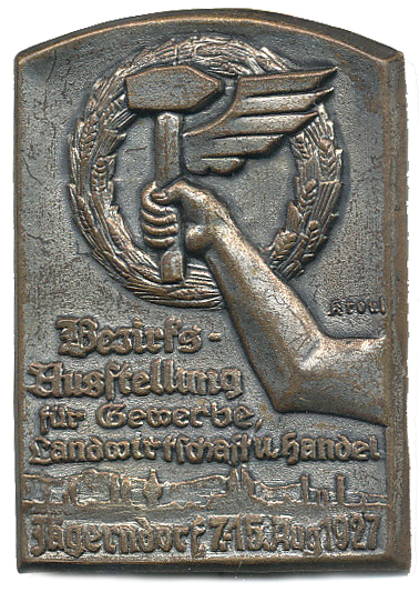 Krnov (Jägendorf) - okresní výstava živností, zemědělství a obchodu 7.-15.8.1927, Dutý bílý plech 30x43 mm_s jehlou
