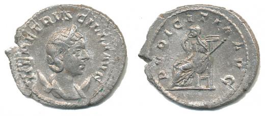AR Antoninianus, Rv:"PVDICITIA.AVG.", sed. Pudicitia zleva s žezlem, var. malá hlava, S.2631, C.19
