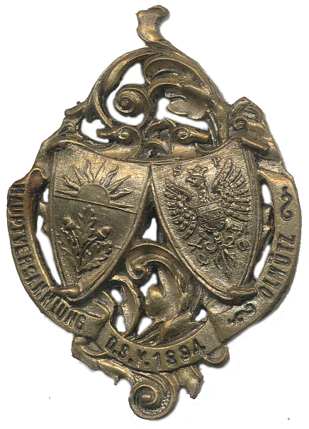 Olomouc (Olmütz) - hlavní shromáždění D.S.V. 1894 Dva znaky v ozdobné kartuši, nápis na stuze bronz.plech odznak 35,5x49 mm_s jehlou