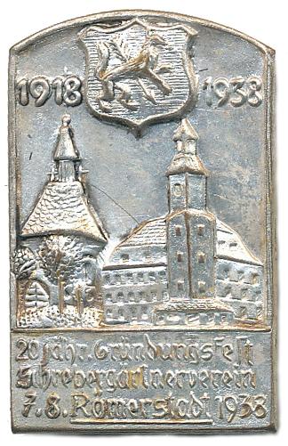 Rýmařov (Römerstadt) - slavnost k 20.výr.založení zahrádkářského spolku 1918 - 7.8.1938, pohled na dominanty a znak města Dutý bílý plech 25,5x40,5 mm_připínací
