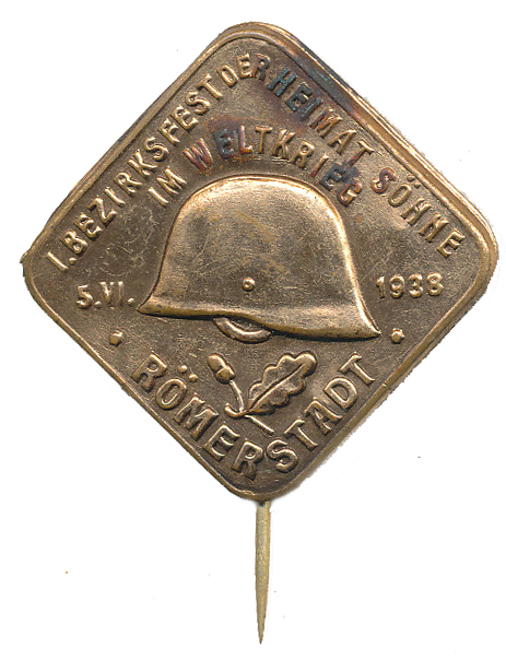 Rýmařov (Römerstadt) -I. okresní slavnost setkání vojáků 1.svět.války 5.VI.1938, uprostřed připlba, dvojitý opis, Dutý bronz.plech 37x37 mm _s jehlou