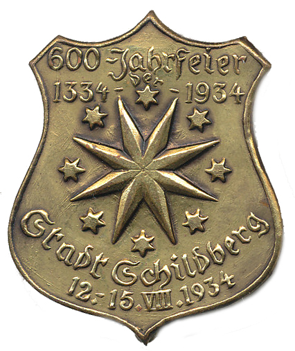Štíty (Schildberg) - slavnost k 600.výročí založení města 1334 - 1934 Hvězda, 4řádk.nápis 12.-15.VIII.1934, Žlutý plech 33x41 mm_připínací