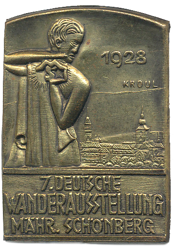 Šumperk (Mähr.Schönberg) - 7.německá putovní výstava 1928 Alegorická postava, v pozadí pohled na město, 3řádk.nápis, Sign.Kroul Dutý mosaz.odznak 29x41 mm_s jehlou