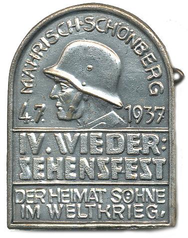 Šumperk (Mähr.Schönberg) - IV.setkání vojáků z 1.světové války 4.7.1937, voják v přilbě, Bílý kov 29x38,5 mm_připínací