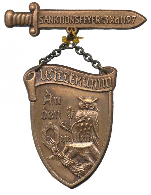Bad Kissingen (An den Quellen) - Uvítací odznak, štít se stuhou nahoře s nápisem WILLEKUMM, výr u dubového pařezu, z písmene Q vytéká pramen, Cu 53x41 mm, 2 řetízky připojen meč s nápisemSANKTIONSFEYER 13.x.A.u.97 (1956)_vodorov.zavírací jehlice