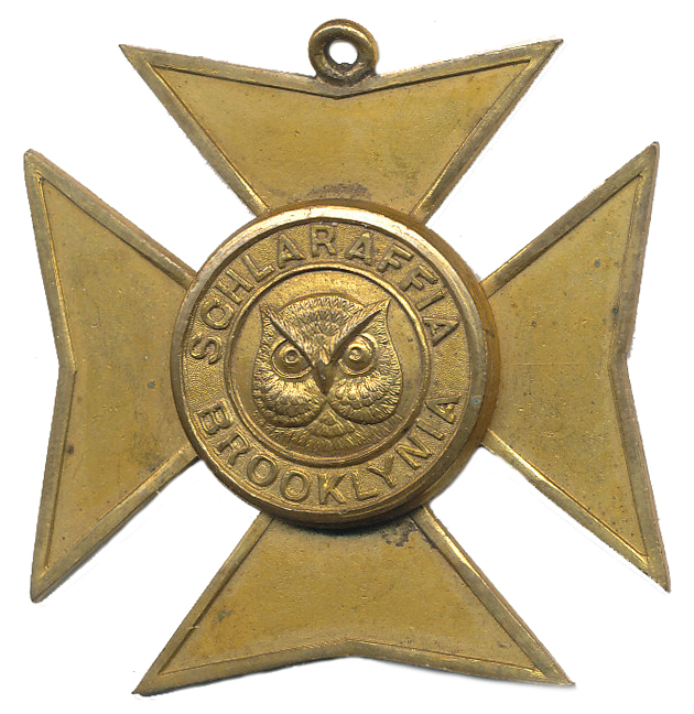 Brooklyn - (Broklynia) - Mosaz. kříž s hladkými širšími rámovanými rameny 49,5x49,5 mm, ve středu hlava výra s opisem v mezikruží SCHLARAFFIA BROOKLYNIA_ouško