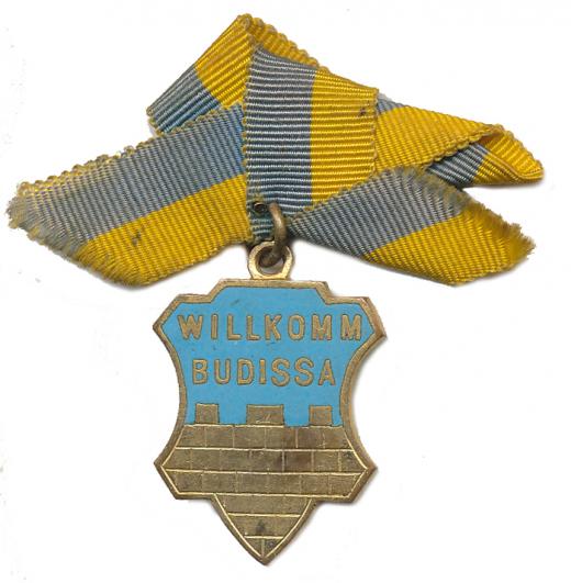 Budyšín - Bautzen (Budissa) - Uvítací odznak, modrý štít se zlatavými hradbami, nápis WILLKOMM BUDISSA, Pozlac.bronz 33,5x23,5 mm _ouško se stuhou