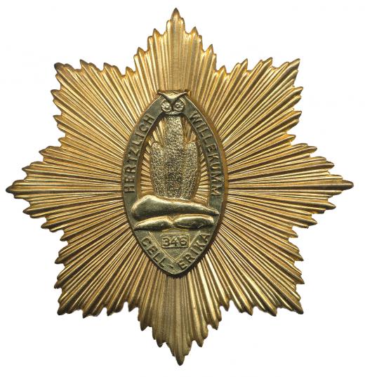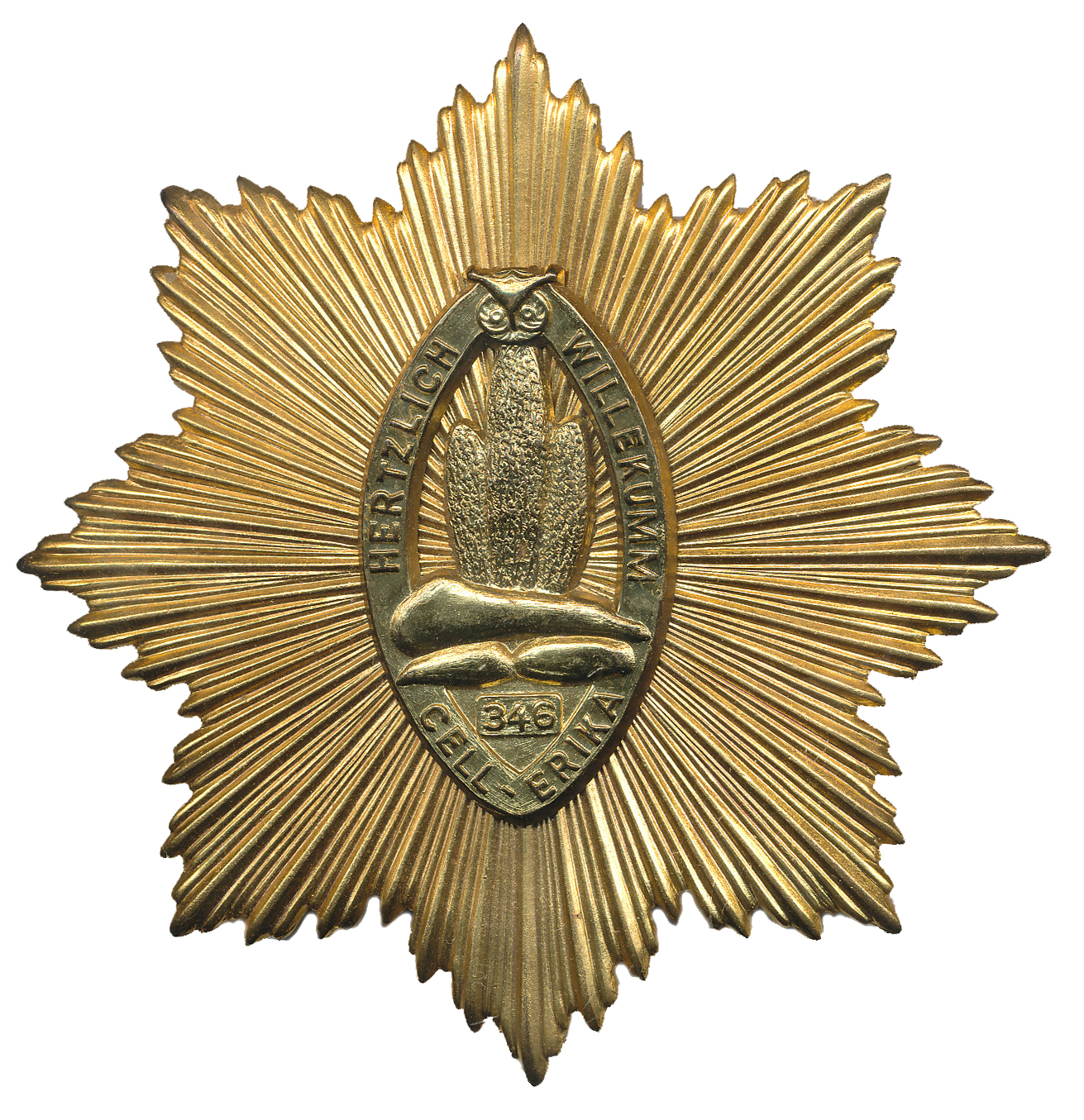 Celle stadt (Cell Erika) - Uvítací řád, 8cípá zlatá paprsčitá hvězda 109 mm, ve středu výr na oblacích číslo spolku 346, opis na stuze HERTZLICH WILLEKUMM_v rev. vodorovná závír.jehlice
